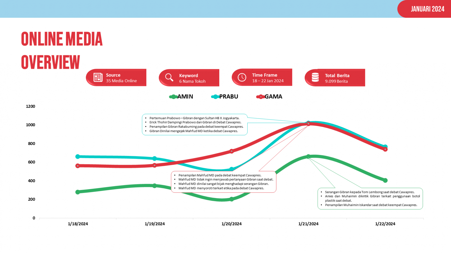 Dari hasil pemantauan online news monitoring didapatkan temuan jika pemberitaan terhadap Calon Presiden dan Calon Wakil Presiden tersebut melonjak naik atau mendapatkan peak time nya pada 21 Januari 2022. Melonjak nya pemberitaan ini terjadi di tanggal tersebut merupakan hari dimana debat keempat Cawapres dilaksanakan oleh Komisi Pemilih Umum (KPU). Jika melihat grafik tersebut diketahui jika Prabowo - Gibran (PRABU) mendapatkan pemberitaan yang paling tinggi pada 21 Januari 2024 jika dibandingkan dengan pasangan Anies - Muhaimin (AMIN) dan Ganjar - Mahfud MD (GAMA).