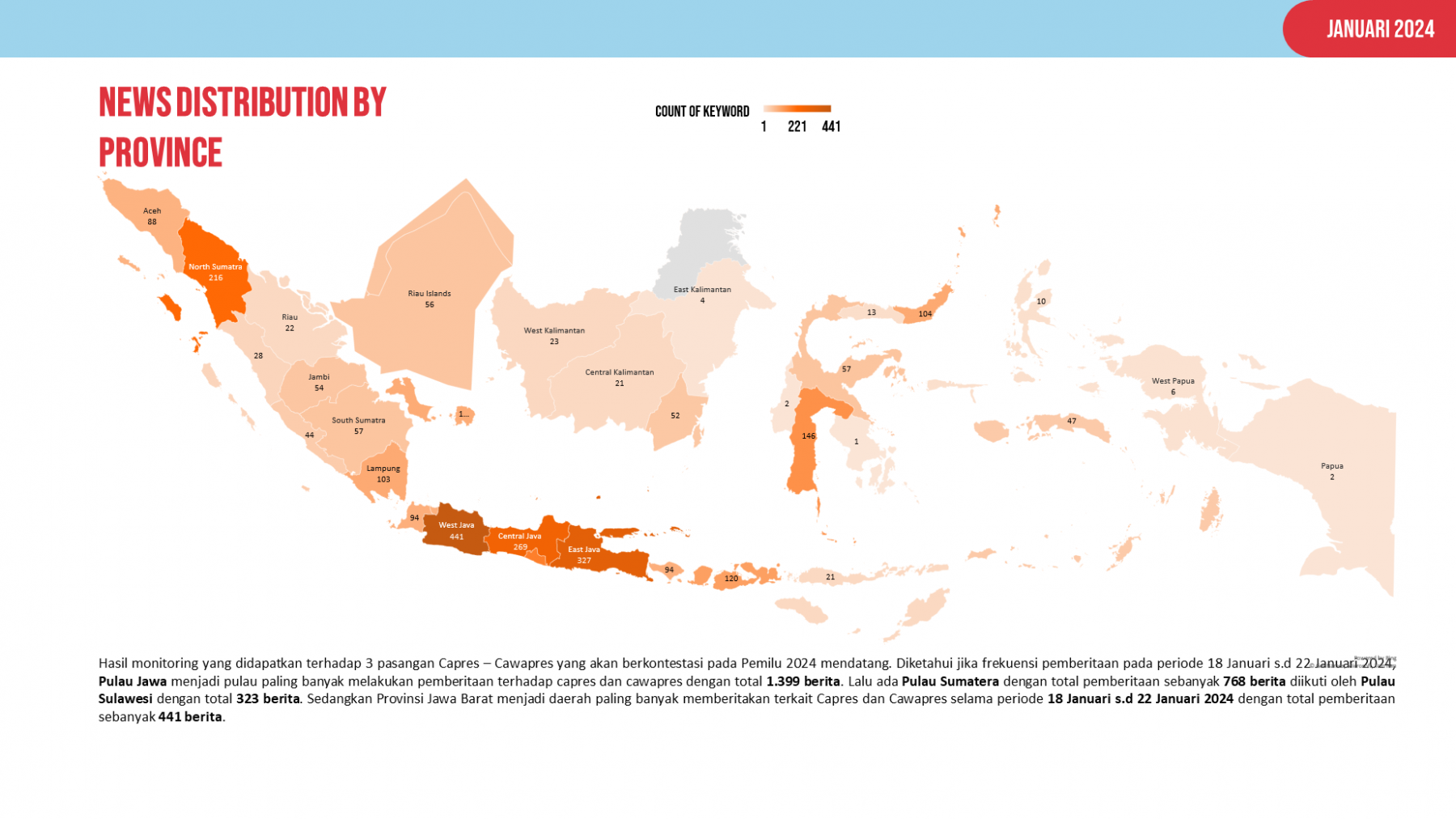 Berdasarkan hasil monitoring online news didapatkan terhadap pasangan Calon Presiden dan Calon Wakil Presiden yang akan berkontestasi pada Pemilu 2024. Diketahui jika Pulau Jawa menjadi wilayah yang paling banyak melakukan pemberitaan terhadap pasangan Calon Presiden dan Calon Wakil Presiden 2024 pada periode 18 Januari s.d 22 Januari 2024 mendatang. Setelah itu diikuti Pulau Sumatera dengan total pemberitaan sebanyak 768 berita, diikuti oleh Pulau Sulawesi dengan total 323 berita. Provinsi Jawa Barat menjadi wilayah yang paling banyak memberitakan terkait Calon Presiden dan Calon Wakil Presiden dengan total pemberitaan 441 berita untuk periode ini. berita