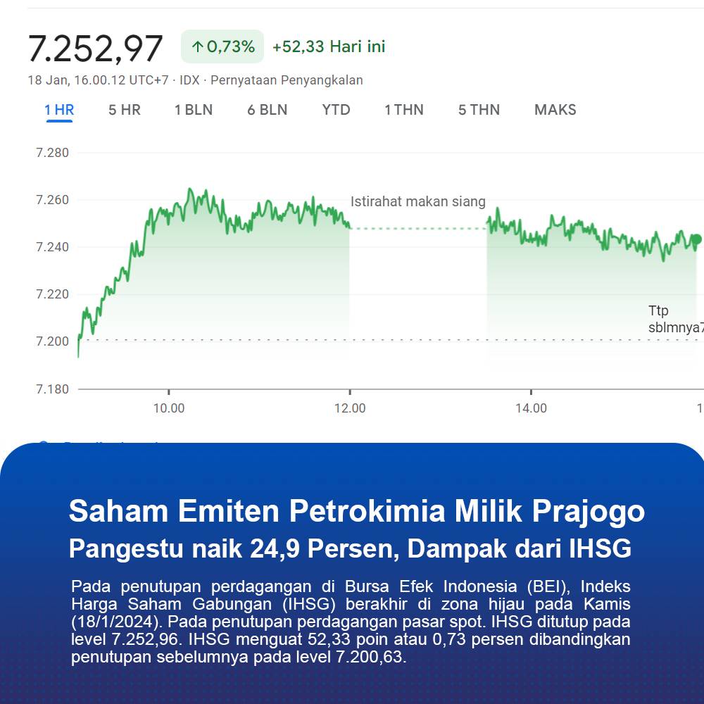 OASEDATA - Bursa Efek Indonesia (BEI) mengakhiri sesi perdagangan hari ini dengan catatan positif, di mana Indeks Harga Saham Gabungan (IHSG) berhasil menutup di zona hijau. Pada Kamis (18/1/2024), IHSG mengalami kenaikan sebesar 52,33 poin atau 0,73 persen, mencapai level 7.252,96 dibandingkan penutupan sebelumnya yang berada di level 7.200,63.